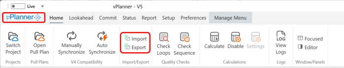 Premium Users (Site Admin, Project Admin, and Production Managers) have access to all the Import/Export tools found under the vPlanner menu or the Home Ribbon.