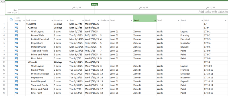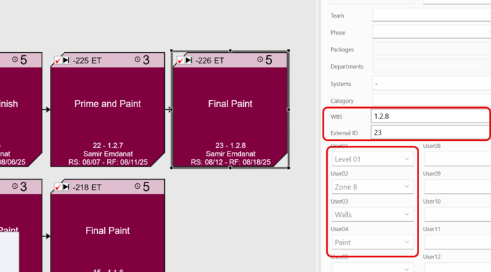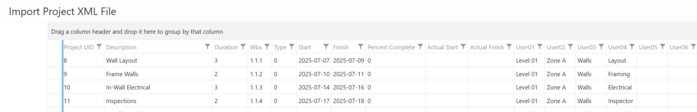 Figure 79 – Final Result - User Fields, WBS, and External ID populated from MS Project Data