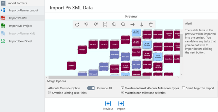 Step 5: The preview screen provides a preview of the final import will look like before bringing the tasks into the project. Here you can make final adjustments to logic or delete tasks that you do not wish to import. If you make a mistake, you can undo or you can switch back to the previous screen and then the preview screen to reset it. Click Import to bring the tasks into the project.