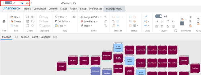 The results of the import will then be shown in the Manage View and you will be switched automatically to semi-live mode. The imported tasks are not saved at this point and you can review them in the context of other tasks in the project. You can save them or discard them using the buttons at the upper-left side of the vPlanner window then switch back to live mode.