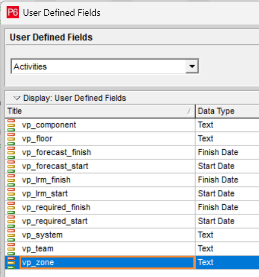 If you plan to Export from vPlanner and import into P6, see the P6 Export section for additional User Defined Fields that you should set up in P6 to store vPlanner dates.