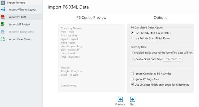 Step 3: The next screen provides a list of identified codes in the XML file and provides some options and settings for the import. If you have not yet coded vPlanner with the same codes in the XML file. This is good place to stop, copy the list under P6 Codes Preview and keep them in a text file to configure vPlanner attributes with values matching what you are bringing from P6 or make corrections in P6 and re-export the XML.