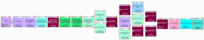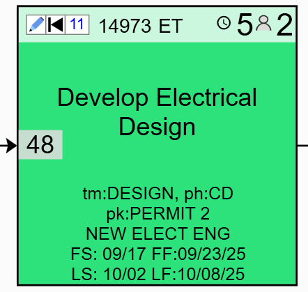 When the longest path analysis is performed with this option enabled, each task will have an overlay to display the path length from that task to the target task used to start the analysis measured in business days. The number will be shown in a gray box on the center-left side of the task. This is helpful when trying to identify possible ways to recover time along the longest paths. This can be reset by clicking the Reset Values button.