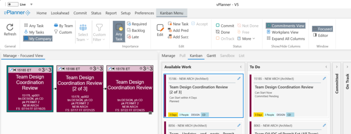 Select the Manage View and click the Commit menu in the ribbon to open the Commit tools. Click My Tasks or My Company tasks, then click the Available work button. vPlanner will display the available work into a daily swimlane arranged vertically.