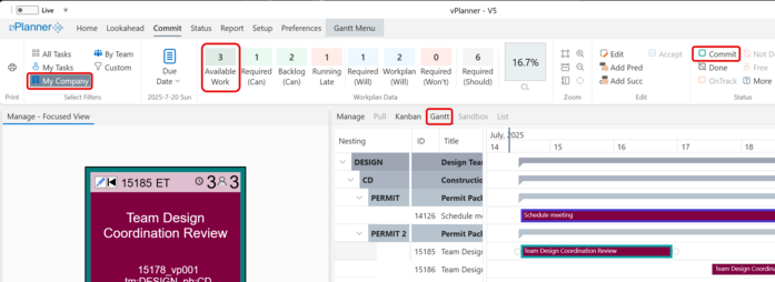 Select the Gantt View and click the Commit menu in the ribbon to open the Commit tools. Click My Tasks or My Company tasks, then click the Available work button. vPlanner will display the available work in the Gantt View. We recommend that you always use the Focused View when using the Gantt View to make commitments as it will show you the selected tasks in the context of the larger plan.