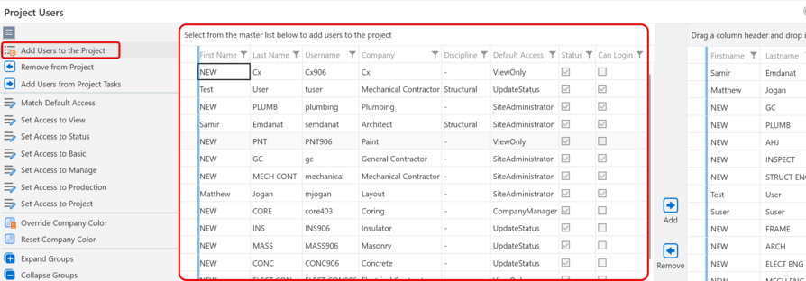 Select user rows from the master list and click the Add button to add those users to the project. If they are already in the project nothing will change for those users. When users are added to a project, their project level access will match their default access.