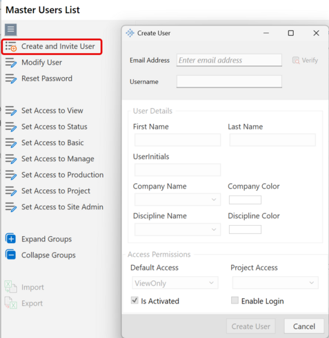 Click the Create or Invite User from the left Menu. Fill in the email and username fields. Click the Verify button to double check that this combination of email + username does not exist already. If the combination already exists, you can simply add the user to the project from the Project Users panel. Otherwise, the bottom section of the window will unlock so you can fill in the user information.