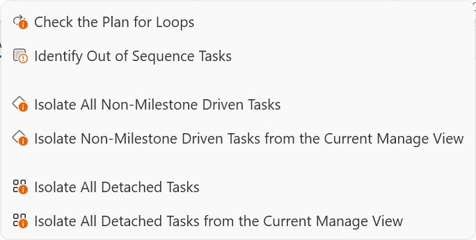Use the tools under the quality checks section to improve the quality of the plan. For example, you can isolate tasks that are part of an emerging loop that prevent the calculation engine from running. Or identify out of sequence work such as tasks that are marked complete without their predecessors being complete.