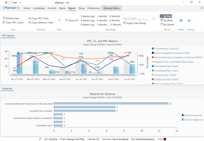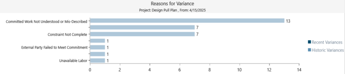The reasons for variance will show the categories of why tasks failed to be completed and charts the result. If you click the Details button under the Report menu, you can see the full details of the variances and their root causes.