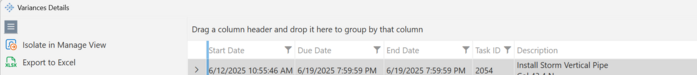 You can also use the Isolate in Manage View button to find the tasks are selected in the variance details and isolate them in the Manage View for a detailed impact analysis by tracing their successors for example.